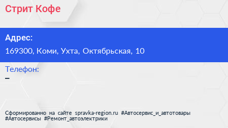 Стрит Кофе по адресу 169300, Коми, Ухта, Октябрьская, 10 в дальнейшем Организация, размещена в следующих категориях: