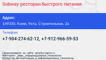 Subway, ресторан быстрого питания по адресу 169330, Коми, Ухта, Строительная, 2а в дальнейшем Организация, размещена в следующих категориях: