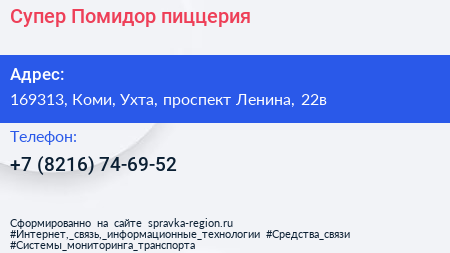 Супер Помидор, пиццерия по адресу 169313, Коми, Ухта, проспект Ленина, 22в в дальнейшем Организация, размещена в следующих категориях: