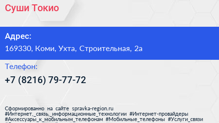 Суши Токио по адресу 169330, Коми, Ухта, Строительная, 2а в дальнейшем Организация, размещена в следующих категориях:
