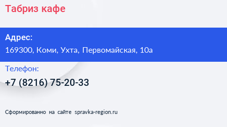 Табриз, кафе по адресу 169300, Коми, Ухта, Первомайская, 10а в дальнейшем Организация, размещена в следующих категориях: