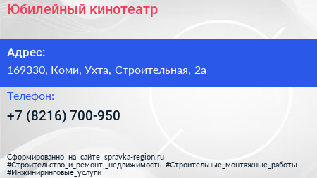 Юбилейный, кинотеатр по адресу 169330, Коми, Ухта, Строительная, 2а в дальнейшем Организация, размещена в следующих категориях: