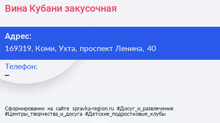 Вина Кубани, закусочная по адресу 169319, Коми, Ухта, проспект Ленина, 40 в дальнейшем Организация, размещена в следующих категориях: