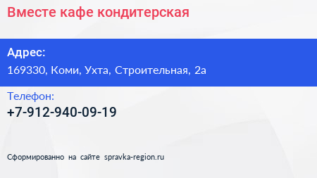 Вместе, кафе-кондитерская по адресу 169330, Коми, Ухта, Строительная, 2а в дальнейшем Организация, размещена в следующих категориях: