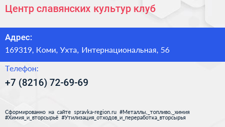 Центр славянских культур, клуб по адресу 169319, Коми, Ухта, Интернациональная, 56 в дальнейшем Организация, размещена в следующих категориях: