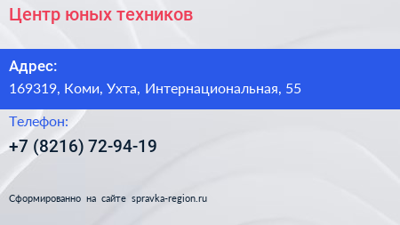 Центр юных техников по адресу 169319, Коми, Ухта, Интернациональная, 55 в дальнейшем Организация, размещена в следующих категориях:
