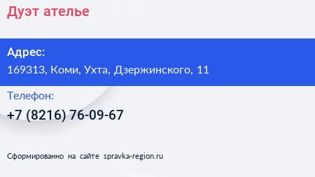Дуэт, ателье по адресу 169313, Коми, Ухта, Дзержинского, 11 в дальнейшем Организация, размещена в следующих категориях: