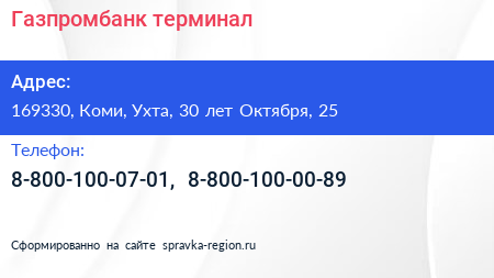 Газпромбанк, терминал по адресу 169330, Коми, Ухта, 30 лет Октября, 25 в дальнейшем Организация, размещена в следующих категориях: