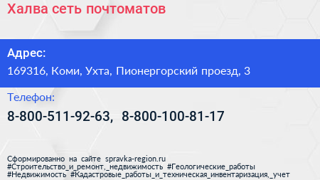 Халва, сеть почтоматов по адресу 169316, Коми, Ухта, Пионергорский проезд, 3 в дальнейшем Организация, размещена в следующих категориях: