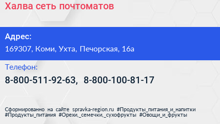 Халва, сеть почтоматов по адресу 169307, Коми, Ухта, Печорская, 16а в дальнейшем Организация, размещена в следующих категориях:
