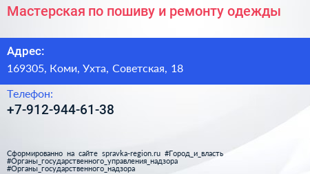 Мастерская по пошиву и ремонту одежды по адресу 169305, Коми, Ухта, Советская, 18 в дальнейшем Организация, размещена в следующих категориях: