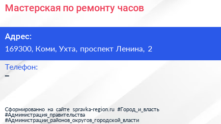 Мастерская по ремонту часов по адресу 169300, Коми, Ухта, проспект Ленина, 2 в дальнейшем Организация, размещена в следующих категориях: