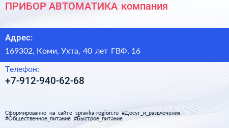 ПРИБОР АВТОМАТИКА, компания по адресу 169302, Коми, Ухта, 40 лет ГВФ, 16 в дальнейшем Организация, размещена в следующих категориях: