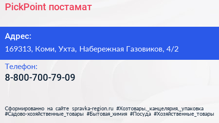PickPoint, постамат по адресу 169313, Коми, Ухта, Набережная Газовиков, 4/2 в дальнейшем Организация, размещена в следующих категориях: