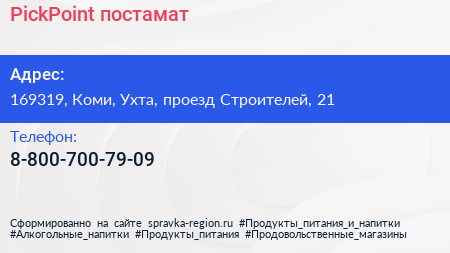 PickPoint, постамат по адресу 169319, Коми, Ухта, проезд Строителей, 21 в дальнейшем Организация, размещена в следующих категориях: