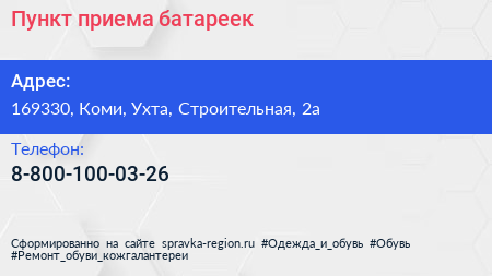 Пункт приема батареек по адресу 169330, Коми, Ухта, Строительная, 2а в дальнейшем Организация, размещена в следующих категориях: