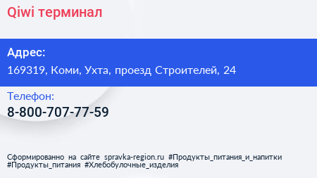 Qiwi, терминал по адресу 169319, Коми, Ухта, проезд Строителей, 24 в дальнейшем Организация, размещена в следующих категориях: