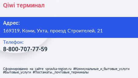 Qiwi, терминал по адресу 169319, Коми, Ухта, проезд Строителей, 21 в дальнейшем Организация, размещена в следующих категориях: