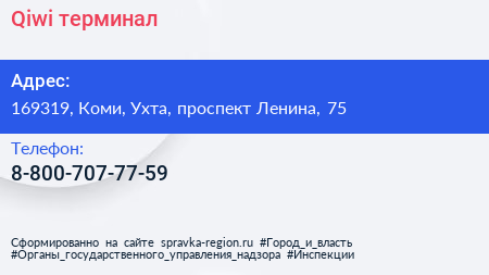 Qiwi, терминал по адресу 169319, Коми, Ухта, проспект Ленина, 75 в дальнейшем Организация, размещена в следующих категориях: