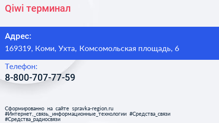Qiwi, терминал по адресу 169319, Коми, Ухта, Комсомольская площадь, 6 в дальнейшем Организация, размещена в следующих категориях: