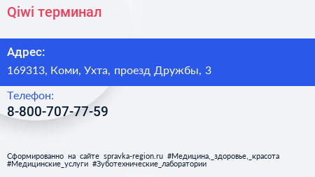 Qiwi, терминал по адресу 169313, Коми, Ухта, проезд Дружбы, 3 в дальнейшем Организация, размещена в следующих категориях: