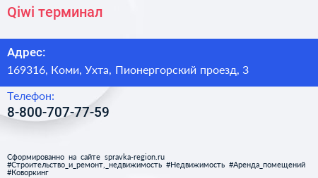 Qiwi, терминал по адресу 169316, Коми, Ухта, Пионергорский проезд, 3 в дальнейшем Организация, размещена в следующих категориях: