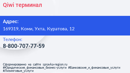 Qiwi, терминал по адресу 169319, Коми, Ухта, Куратова, 12 в дальнейшем Организация, размещена в следующих категориях: