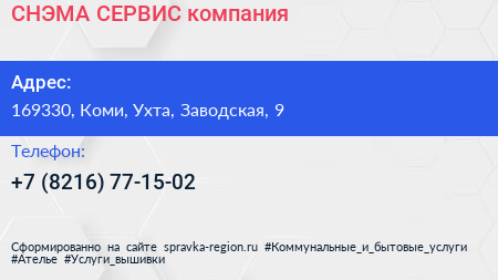 СНЭМА-СЕРВИС, компания по адресу 169330, Коми, Ухта, Заводская, 9 в дальнейшем Организация, размещена в следующих категориях: