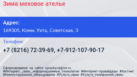 Зима, меховое ателье по адресу 169305, Коми, Ухта, Советская, 3 в дальнейшем Организация, размещена в следующих категориях: