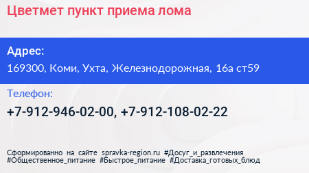 Цветмет, пункт приема лома по адресу 169300, Коми, Ухта, Железнодорожная, 16а ст59 в дальнейшем Организация, размещена в следующих категориях: