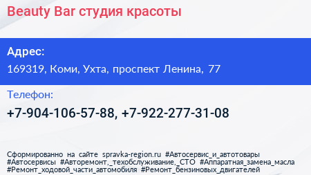 Beauty Bar, студия красоты по адресу 169319, Коми, Ухта, проспект Ленина, 77 в дальнейшем Организация, размещена в следующих категориях: