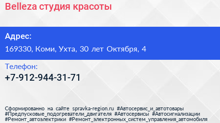 Belleza, студия красоты по адресу 169330, Коми, Ухта, 30 лет Октября, 4 в дальнейшем Организация, размещена в следующих категориях: