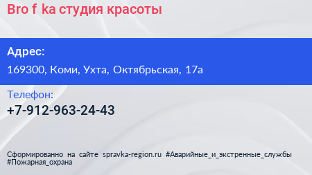 Bro.f.ka, студия красоты по адресу 169300, Коми, Ухта, Октябрьская, 17а в дальнейшем Организация, размещена в следующих категориях: