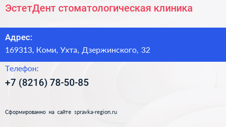 ЭстетДент, стоматологическая клиника по адресу 169313, Коми, Ухта, Дзержинского, 32 в дальнейшем Организация, размещена в следующих категориях: