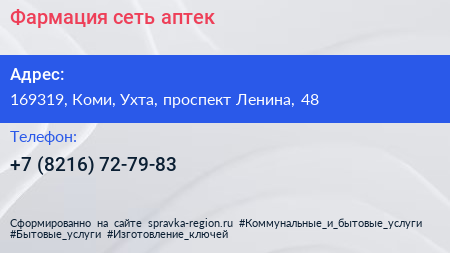 Фармация, сеть аптек по адресу 169319, Коми, Ухта, проспект Ленина, 48 в дальнейшем Организация, размещена в следующих категориях: