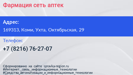Фармация, сеть аптек по адресу 169313, Коми, Ухта, Октябрьская, 29 в дальнейшем Организация, размещена в следующих категориях:
