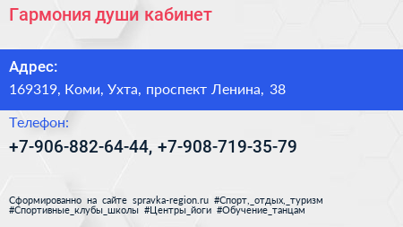 Гармония души, кабинет по адресу 169319, Коми, Ухта, проспект Ленина, 38 в дальнейшем Организация, размещена в следующих категориях: