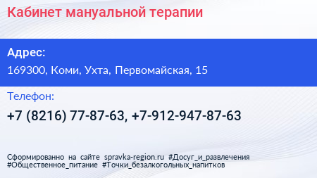Кабинет мануальной терапии по адресу 169300, Коми, Ухта, Первомайская, 15 в дальнейшем Организация, размещена в следующих категориях: