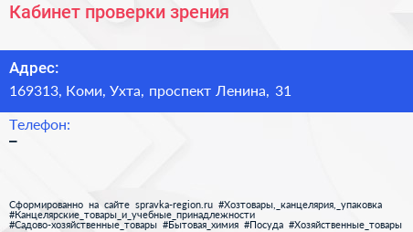 Кабинет проверки зрения по адресу 169313, Коми, Ухта, проспект Ленина, 31 в дальнейшем Организация, размещена в следующих категориях: