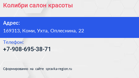 Колибри, салон красоты по адресу 169313, Коми, Ухта, Оплеснина, 22 в дальнейшем Организация, размещена в следующих категориях: