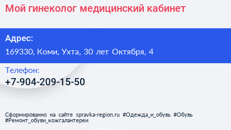 Мой гинеколог, медицинский кабинет по адресу 169330, Коми, Ухта, 30 лет Октября, 4 в дальнейшем Организация, размещена в следующих категориях: