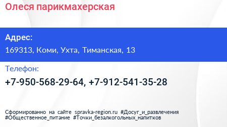 Олеся, парикмахерская по адресу 169313, Коми, Ухта, Тиманская, 13 в дальнейшем Организация, размещена в следующих категориях: