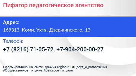 Пифагор, педагогическое агентство по адресу 169313, Коми, Ухта, Дзержинского, 13 в дальнейшем Организация, размещена в следующих категориях: