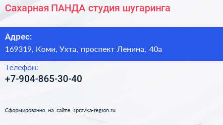 Сахарная ПАНДА, студия шугаринга по адресу 169319, Коми, Ухта, проспект Ленина, 40а в дальнейшем Организация, размещена в следующих категориях: