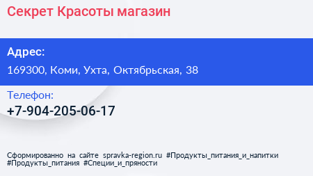 Секрет Красоты, магазин по адресу 169300, Коми, Ухта, Октябрьская, 38 в дальнейшем Организация, размещена в следующих категориях: