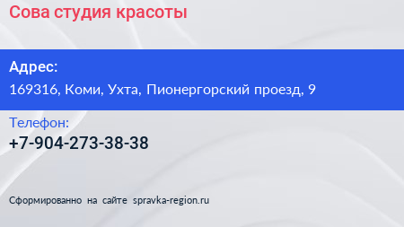 Сова, студия красоты по адресу 169316, Коми, Ухта, Пионергорский проезд, 9 в дальнейшем Организация, размещена в следующих категориях: