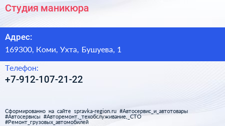 Студия маникюра по адресу 169300, Коми, Ухта, Бушуева, 1 в дальнейшем Организация, размещена в следующих категориях: