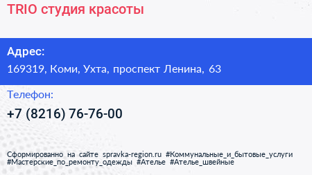 TRIO, студия красоты по адресу 169319, Коми, Ухта, проспект Ленина, 63 в дальнейшем Организация, размещена в следующих категориях:
