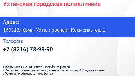 Ухтинская городская поликлиника по адресу 169313, Коми, Ухта, проспект Космонавтов, 1 в дальнейшем Организация, размещена в следующих категориях: