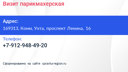 Визит, парикмахерская по адресу 169313, Коми, Ухта, проспект Ленина, 16 в дальнейшем Организация, размещена в следующих категориях: